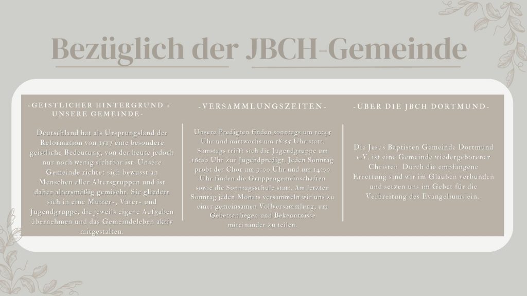 Die Jesus Baptisten Gemeinde Dortmund e.V. ist eine christliche Gemeinde. Da wir alle die Errettung erlangt haben, haben wir miteinander Gemeinschaft und beten für die Verbreitung des Evangeliums.