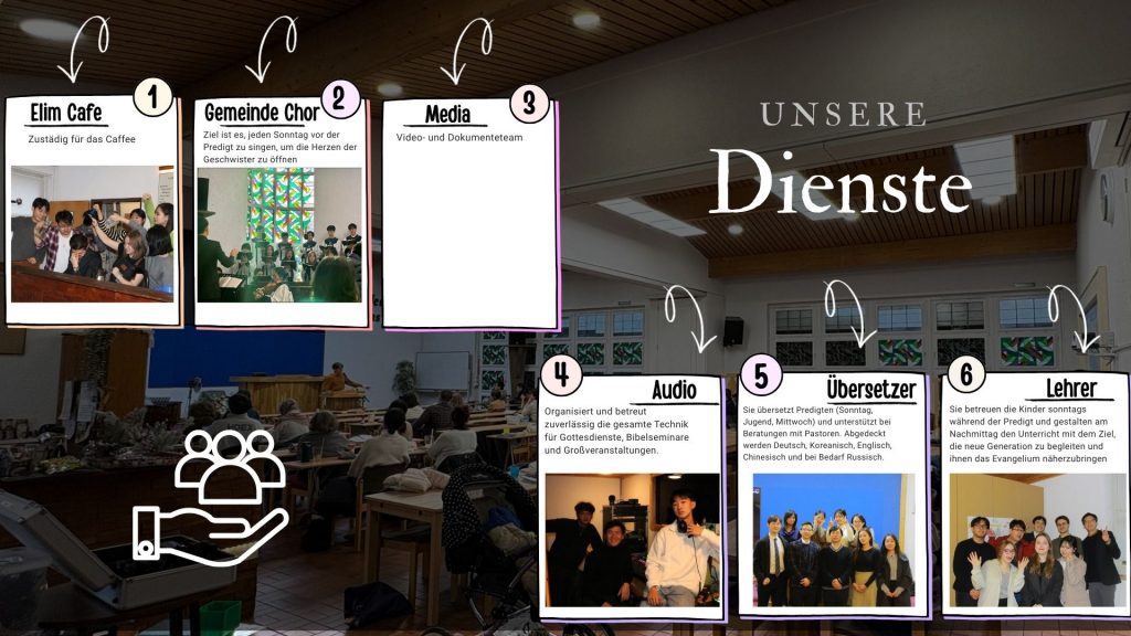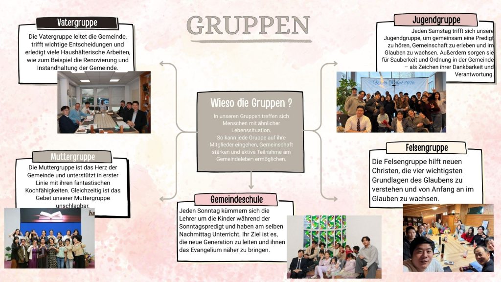 Das Klischee besagt, dass heutzutage nur noch die alten Menschen zur Kirche gehen, was dazu führt, dass die jungen Menschen teils komplett aus dem Fokus der Kirche herausfallen. Unsere Gemeinde dagegen ist vom Alter her ziemlich durchgemischt. Dadurch konnten wir unsere Gemeinschaft auch in drei Hauptgruppen gliedern: Muttergruppe, Vatergruppe und Jugendgruppe. Jede dieser Gruppen erfüllt eigene Aufgaben innerhalb der Gemeinde und ist somit auch wichtig für das Gemeindeleben.
